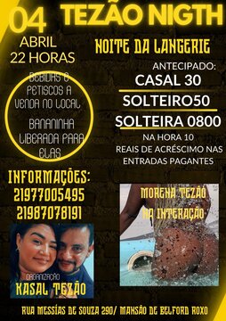 E sábado em dia 12/04 as 22horas e putaria na mansão Rua Messias de Souza 290