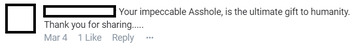 More feedback like this: "Your impeccable Asshole, is the ultimate gift to humanity."